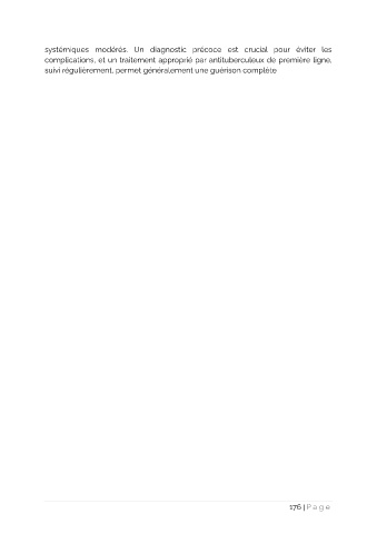 systémiques modérés. Un diagnostic précoce est crucial pour éviter les complications, et un traitement approprié par antituberculeux de première ligne, suivi régulièrement, permet généralement une guérison complète 176 | Pa g e