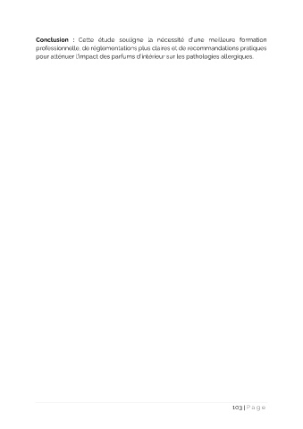 Conclusion : Cette étude souligne la nécessité d'une meilleure formation professionnelle, de réglementations plus claires et de recommandations pratiques pour atténuer l'impact des parfums d'intérieur sur les pathologies allergiques. 103 | Pa g e